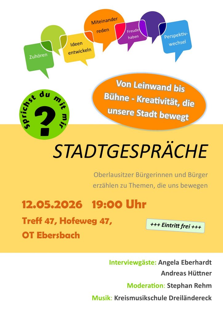 Sie sind interessiert? Dann können Sie das Stadtgespräch am 12. Mai, 19:00 Uhr im Treff 47, Hofeweg 47 im OT Ebersbach, gern fest einplanen.